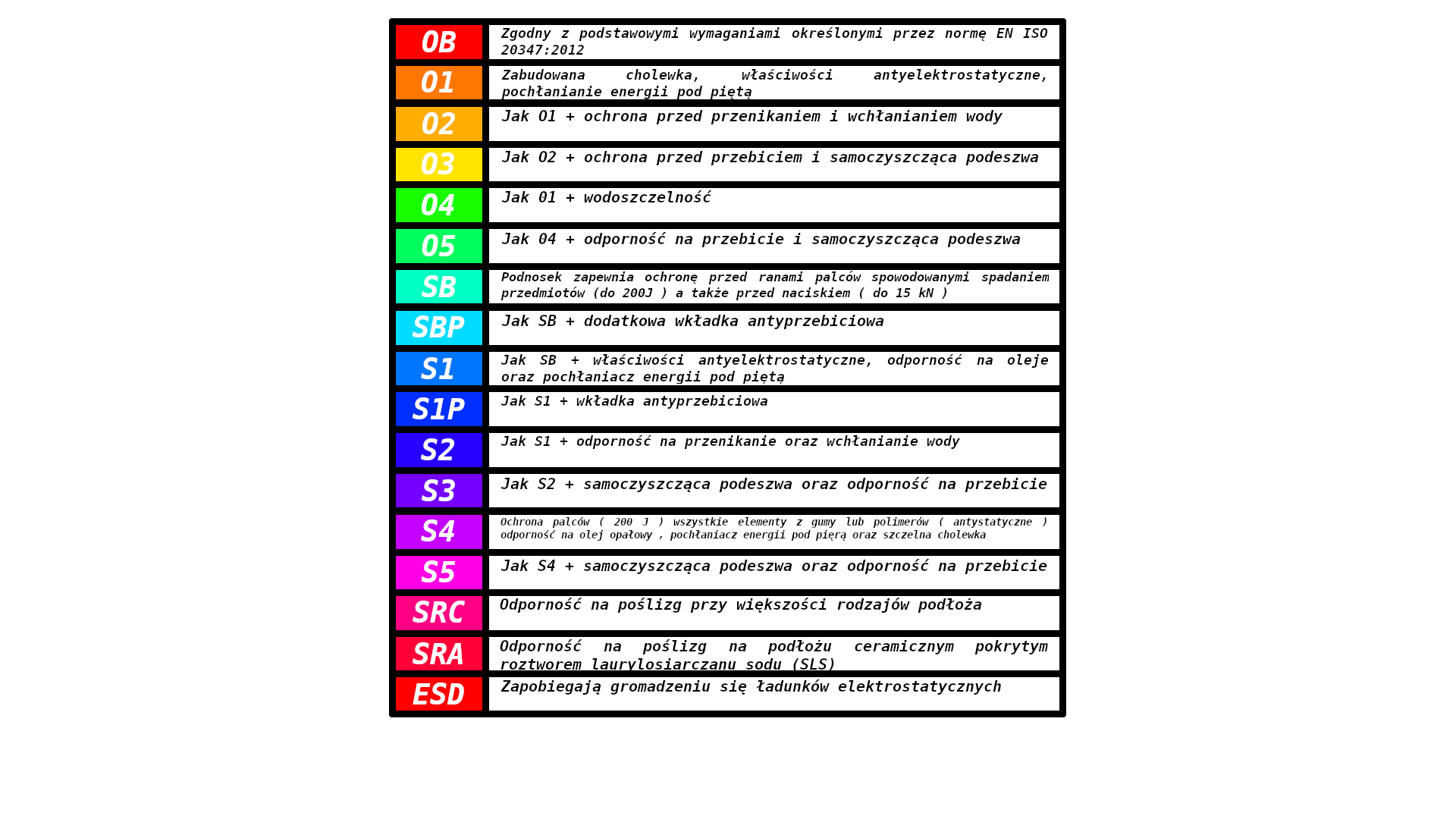 W poniższej tabeli w skrócie rozpisano oznaczenia ochronne butów.